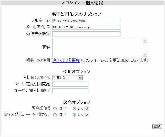 - 設定を変更する際は、Webmail上のメニューの [オプション] > [個人情報] で変更できます。